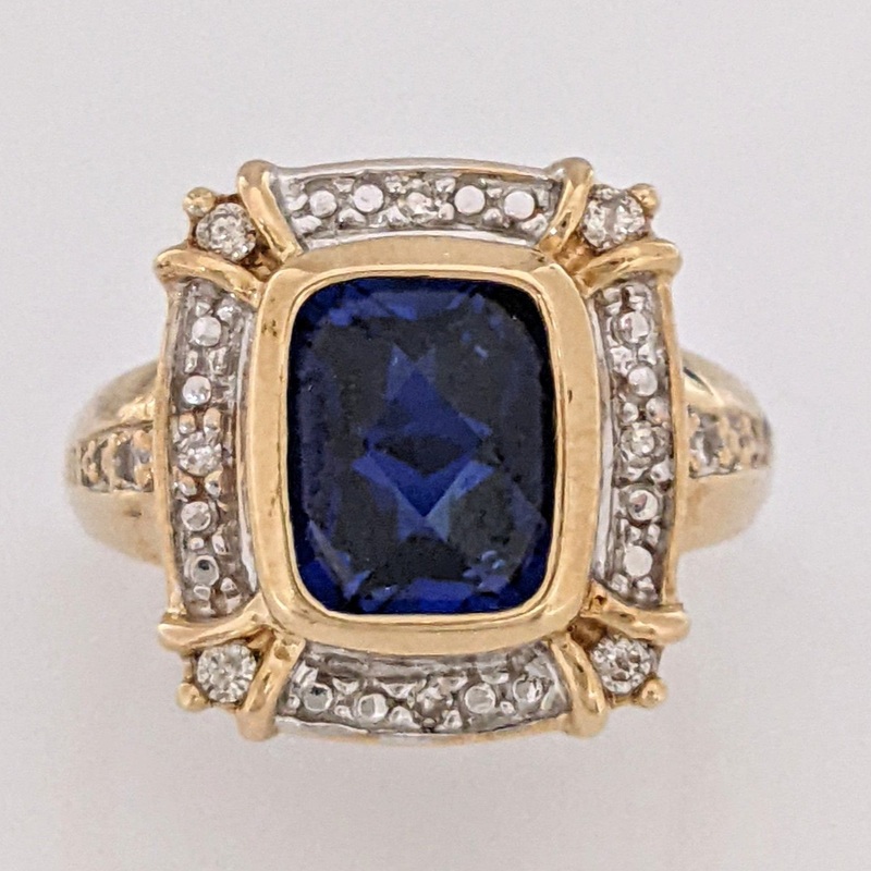 10K LAB-CREATED SAPPHIRE EMERALD CUT 6.5X8.5 WITH .16 DIAMOND TOTAL WEIGHT ESTATE RING 5.2 GRAMS
