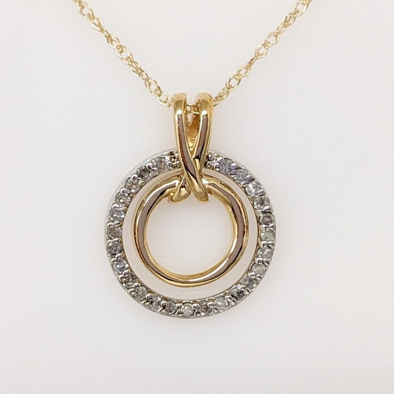 10K TWO-TONE .19 CARAT TOTAL WEIGHT DIAMOND ROUND (25) DOUBLE CIRCLE ESTATE PENDANT & CHAIN 2.5 GRAMS