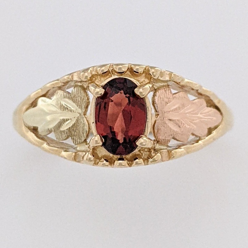 10K TWO-TONE GARNET OVAL 4X6 WITH ROSE LEAF ESTATE RING 2.2 GRAMS