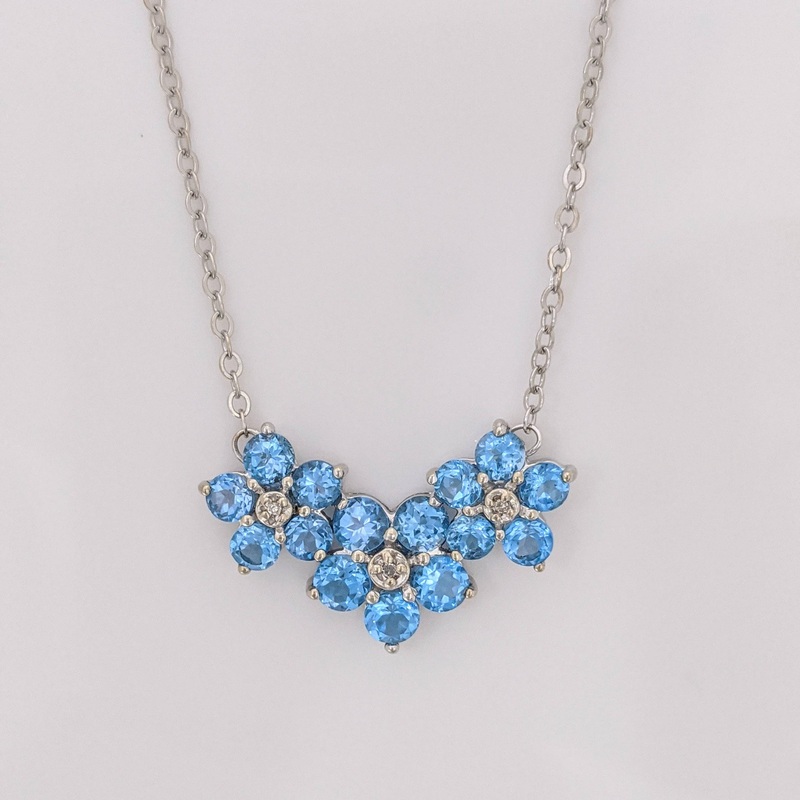 10K WHITE BLUE TOPAZ ROUND (15) 3.5MM FLORAL WITH MELEE ESTATE NECKLACE 4.3 GRAMS