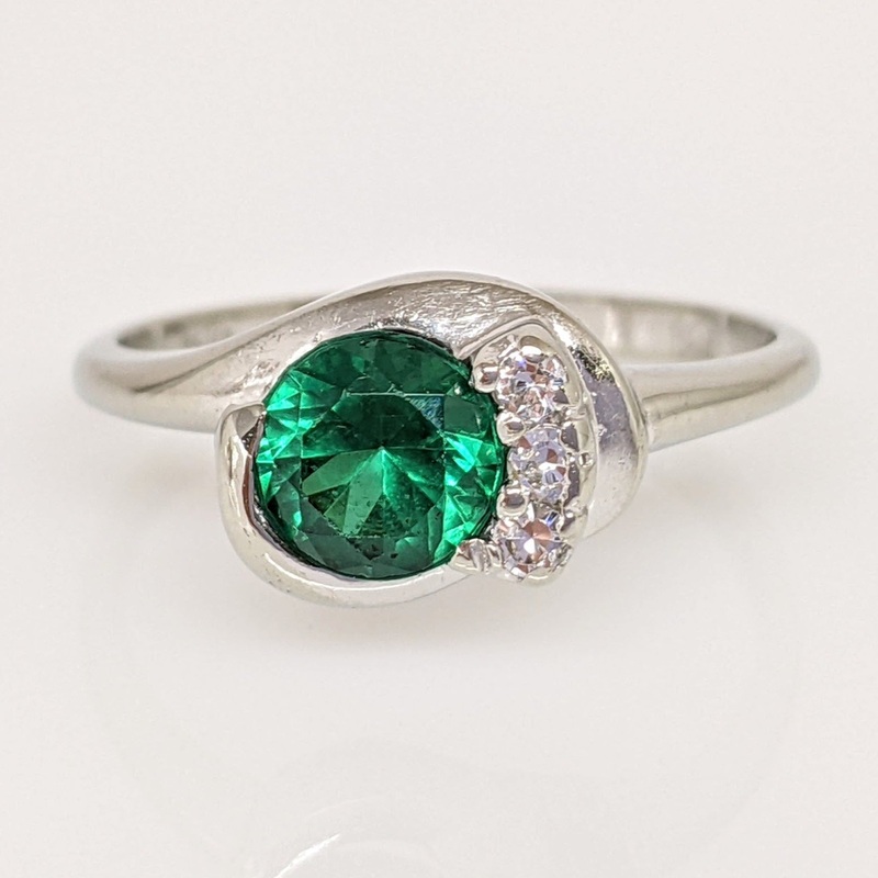 10K WHITE GREEN STONE ROUND 6MM WITH (3) CUBIC ZIRCONIA ESTATE RING 1.8 GRAMS