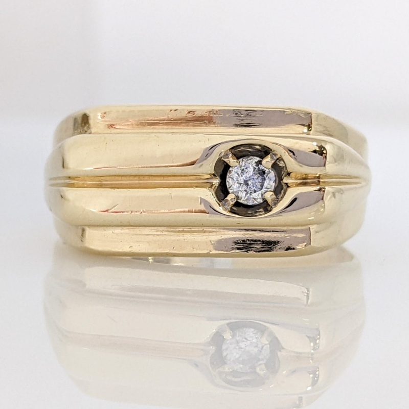 This estate ring features .10 carats of I1-G diamond set in 14K gold for a total weight of 8.3 grams. The I1 clarity allows for the display of unique natural beauty in every diamond, making this a timeless piece.