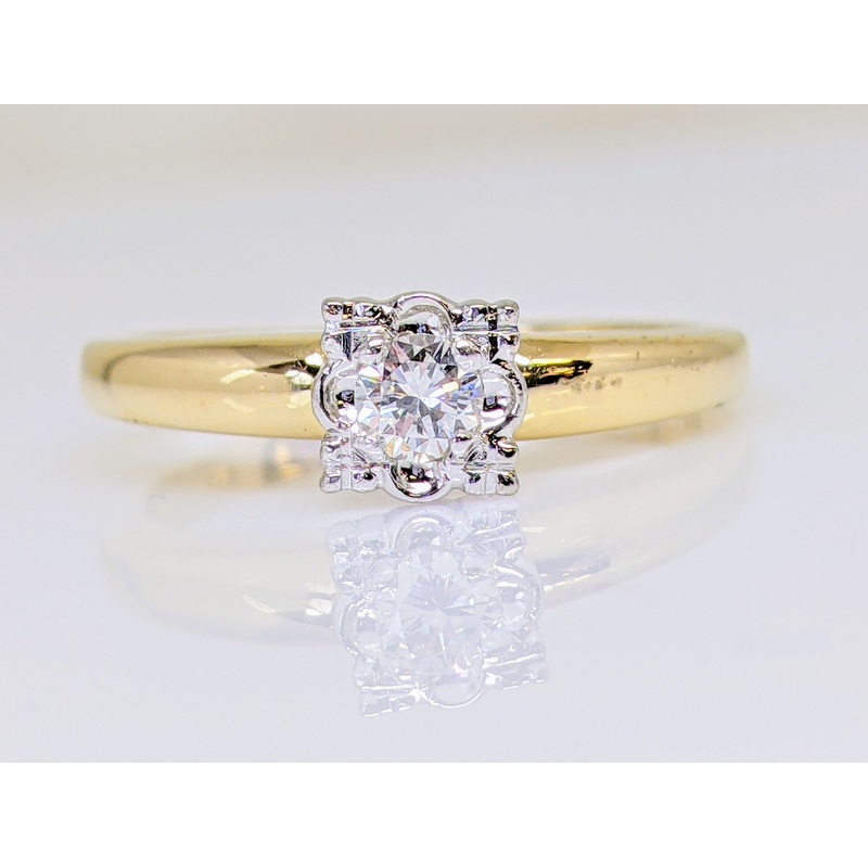 This 14K ring features a round-cut H Color SI1 Clarity diamond, set in a unique square-headed estate ring design. The total carat weight is 0.20 carats, with a weight of 2.5 grams. The perfect piece of estate jewelry for anyone looking for a unique and tim