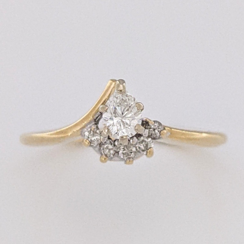 This exquisite estate ring packs a punch of luxurious sophistication. The 14K gold setting perfectly highlights the .22 carat SI2 G diamond pear, with four round melee stones, for a total weight of 2.0 grams. Unique and timeless, this ring is sure to take