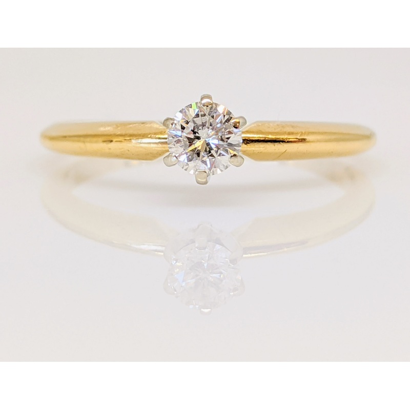 This 14k gold estate ring is the perfect symbol of everlasting love. Featuring a round solitaire diamond with a color grade of 'G' and clarity grade of 'I1', it's sure to sparkle and shine. With a total carat weight of .27 carats, this stunning ring weighs