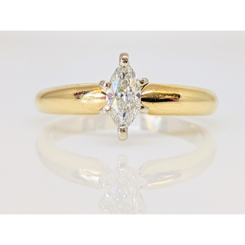 one 14k .33ctw estate diamond ring. The ring contains a center marquise-shape diamond, set into a 6-prong solitaire mounting. The ring weighs 3.0 grams