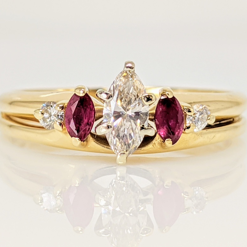 14k .36ctw estate diamond ring. The ring contains one marquise-shape diamond, with two marquise rubies, and two round diamonds. The ring weighs 3.6 grams