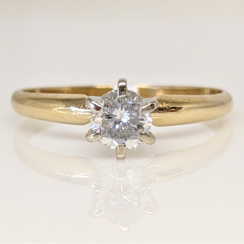 This elegant 14K gold estate ring features a .41 carat round diamond, rated I1 G, set in a six-prong solitaire setting. Crafted with 2.1 grams of gold, this timeless design is sure to last for generations.