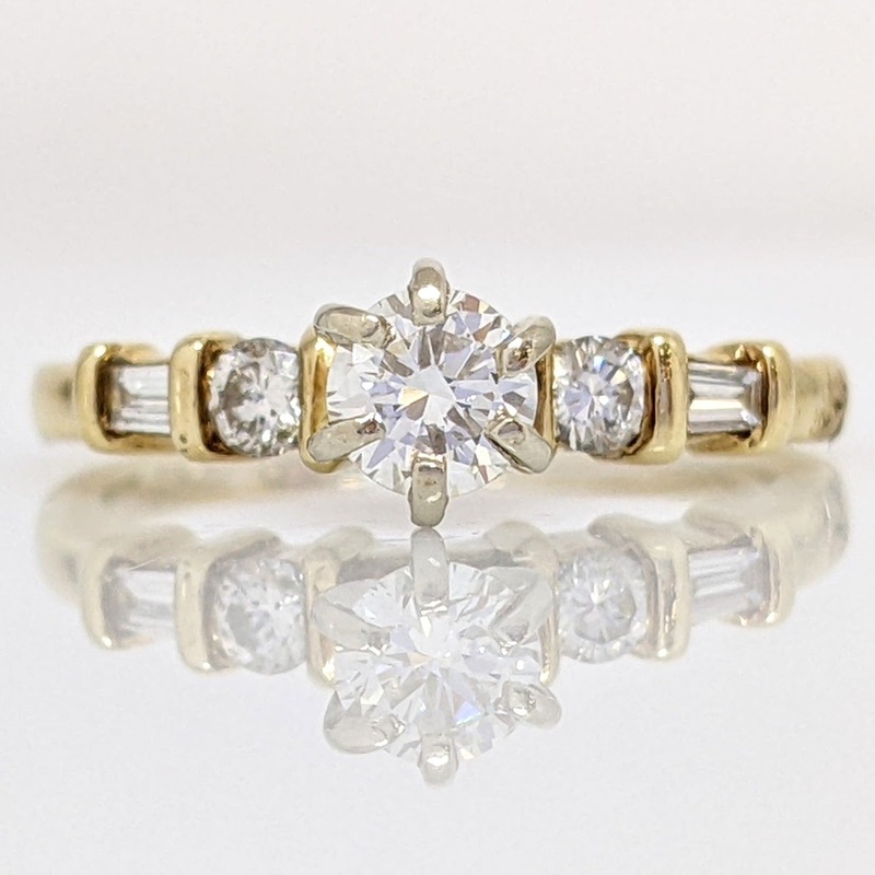 This 14k yellow gold estate ring is crafted with three round and two baguette diamonds for a total weight of .43 carats. These SI1 I diamonds are sure to sparkle with light. The ring itself weighs 2.5 grams for an elegant and timeless look.