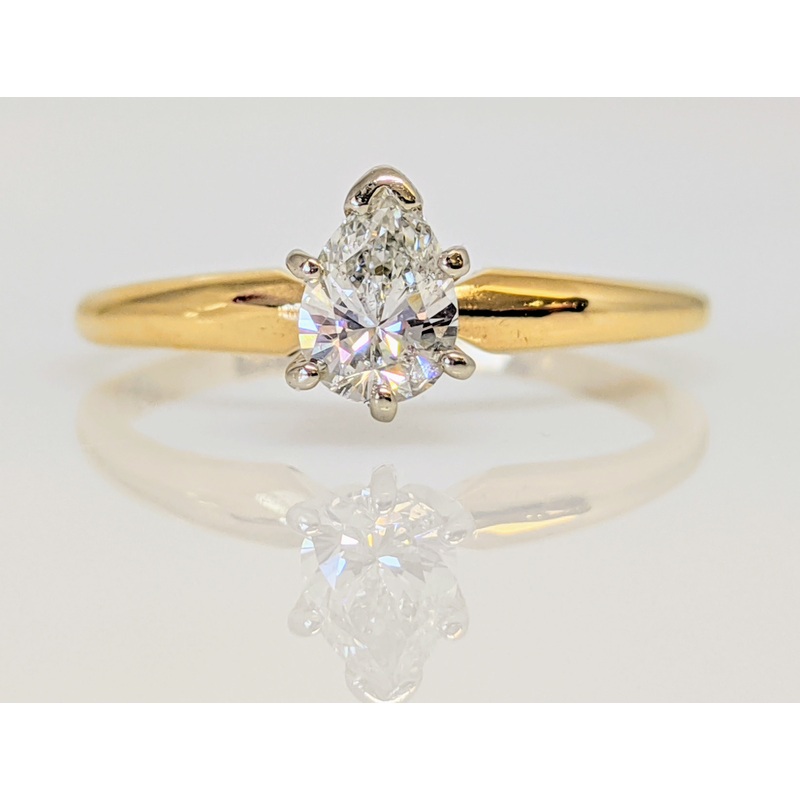 This beautiful 14K gold ring features a .51 carat total SI2 H diamond pear solitaire, elegantly set in a timeless estate ring design. The carefully crafted ring weighs 2.1 grams, offering durability and lasting quality.BIN 101SIZE 7 1/4