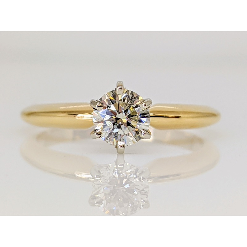 This 14K estate ring features a stunning round solitaire diamond with a total carat weight of .53 and a clarity grade of I1. The exquisite ring is crafted from 2.6 grams of gold, the perfect complement for your diamond.