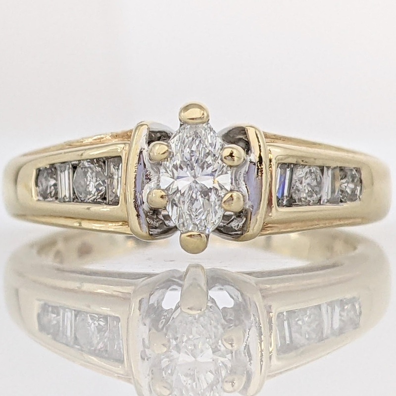 This 14K gold estate ring features a 0.57 carat marquise cut diamond of SI2 clarity and F color, with four round and four baguette cut diamonds for a total weight of 3.9 grams. Perfect for making a statement.BIN 103SIZE 6 1/4