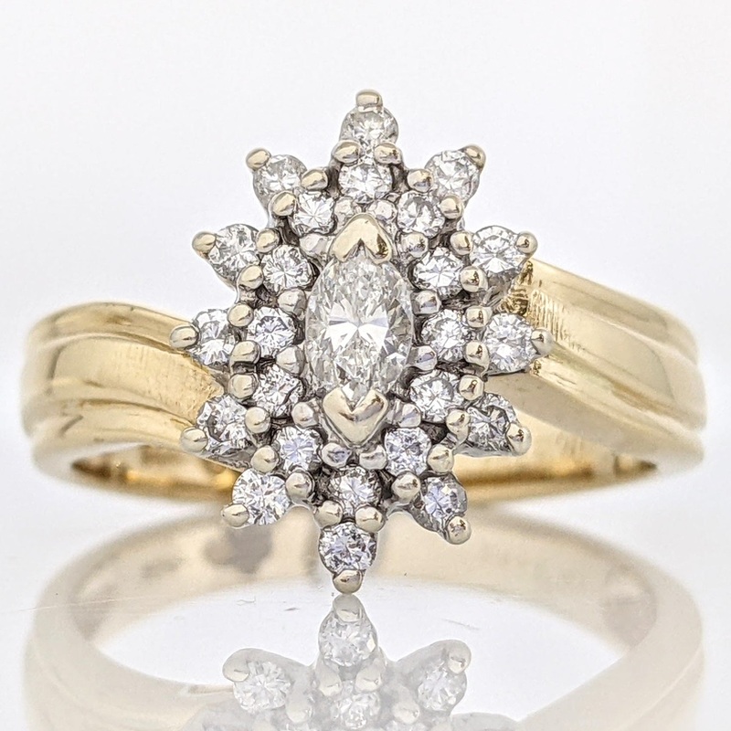This beautifully crafted estate cluster ring will be the star of any jewelry box! Set in 14K gold, it features a centerpiece marquise cut diamond of .63 carat total weight and SI2 G coloring, surrounded by 23 round diamonds to complete the dazzling effect.