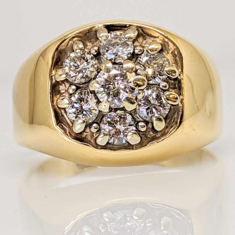 This beautiful diamond cluster ring features seven diamonds, with a total carat weight of .95, set in 14K gold for a combined weight of 9.0 grams. The I1 clarity diamonds are a sparkling H color, making this timeless estate ring a stunning addition to any