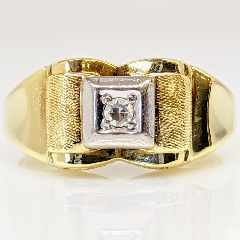 This 14K gold estate ring features a 2mm round diamond embellished with a square-textured top. It has a total weight of 4.5 grams. Its classic design makes it a timeless piece of jewelry.