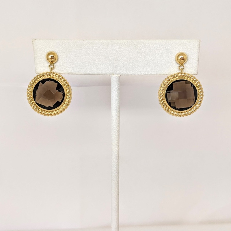 14K SMOKEY QUARTZ ROUND 12MM WITH TRIM ESTATE DANGLE EARRINGS 5.8 GRAMS