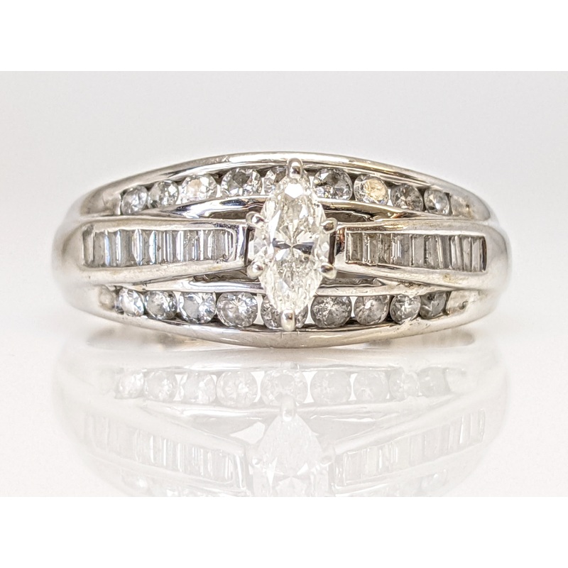 14K WHITE 1.00 CARAT TOTAL WEIGHT I1 F DIAMOND (1) MARQUISE WITH (2) BAGUETTE (18) ROUND MELEE ESTATE RING 4.7 GRAMS
