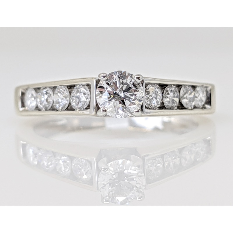 This beautiful estate ring is crafted in 14K white gold and features a .64 carat total weight, I1 H diamond round (9) design. It’s 2.8 grams in weight and guaranteed to make a lasting impression.
