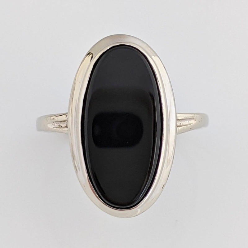 14K WHITE ONYX OVAL 7X18 WITH GOLD TRIM ESTATE RING 2.9 GRAMS