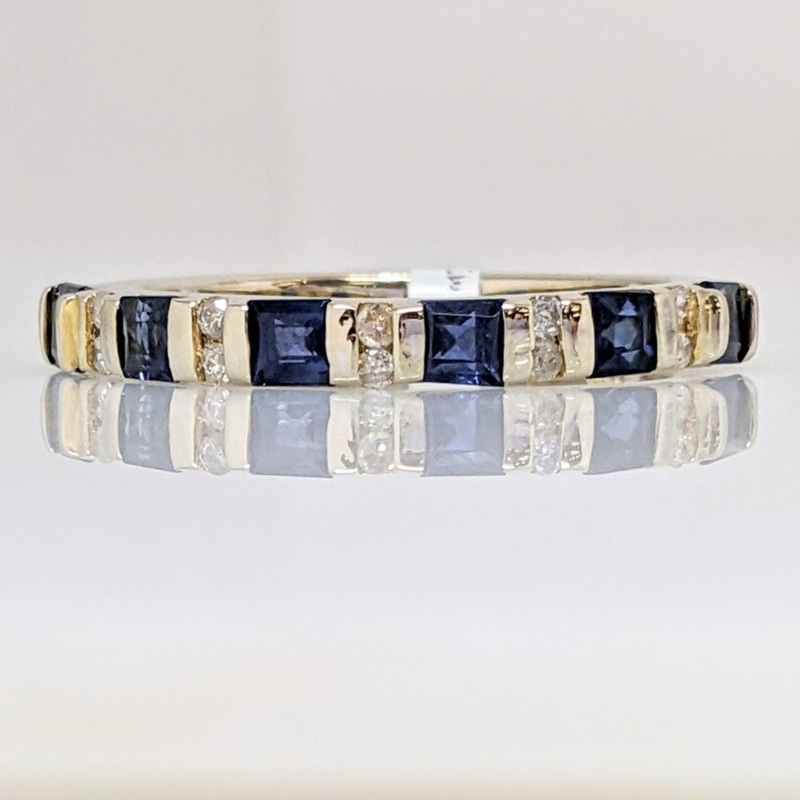 This elegant 14KW estate band showcases six splendid princess-cut sapphire gems alongside .10ct of diamond accents. The 2.5mm stones sparkle with a total weight of 2.5 grams for a timeless yet statement-making look.SIZE 7BIN 513
