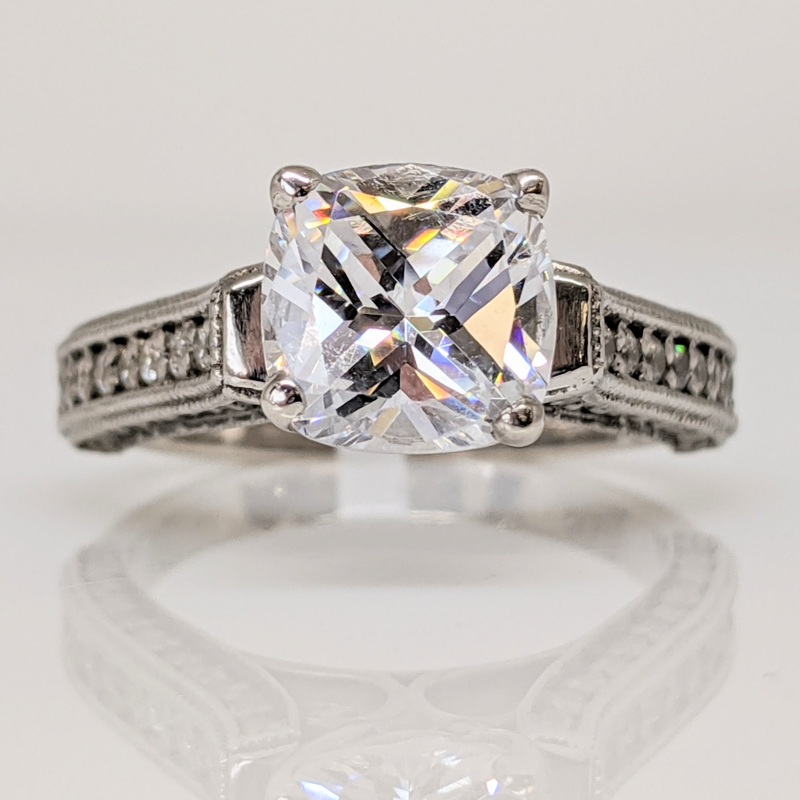 14KW CUBIC ZIRCONIA CUSHION CUT 8MM WITH CUBIC ZIRCONIA MELEE ESTATE RING 4.9 GRAMS