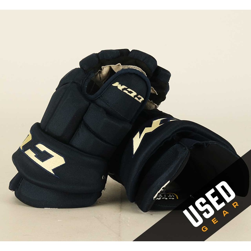 These gloves have been used. The palms and exterior show noticeable wear and may have a lingering hockey odor. Brand CCM SKU: UPC: Team Columbus Blue Jackets Player Jake Christiansen Primary Color Navy Blue Model HGTKSP Cuff Yes Size 15" Width Standard Age