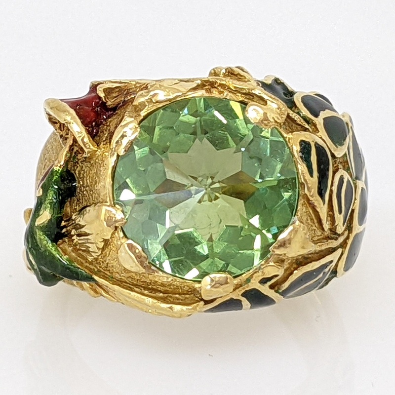18K GREEN TOURMALINE 10MM WITH ENAMEL LEAF/ BIRD ESTATE RING 15.5 GRAMS