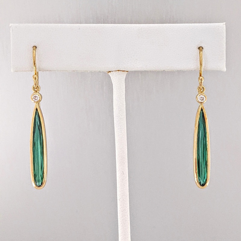 18K GREEN TOURMALINE PEAR 4X23 WITH .10DTW (2) ESTATE DANGLE EARRINGS 5.1 GRAMS