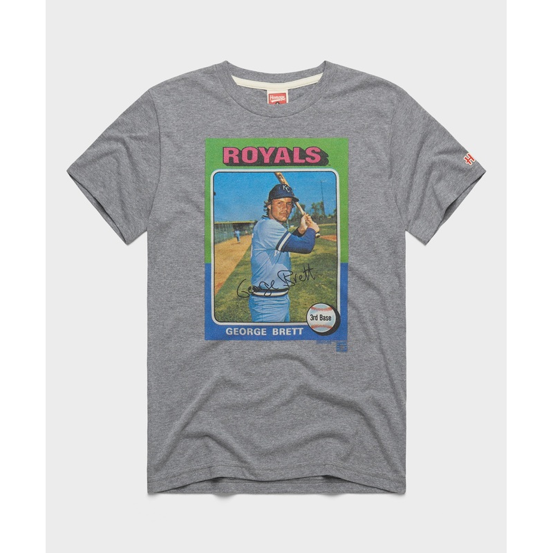George Bretts Topps rookie card a true collectors item and now all yours to wear in a super soft T-shirt. The forever KC Royal sits in an exclusive club: hes one of only four players to reach 3,000+ hits, 300 home runs and a .300+ batting average. Tear it