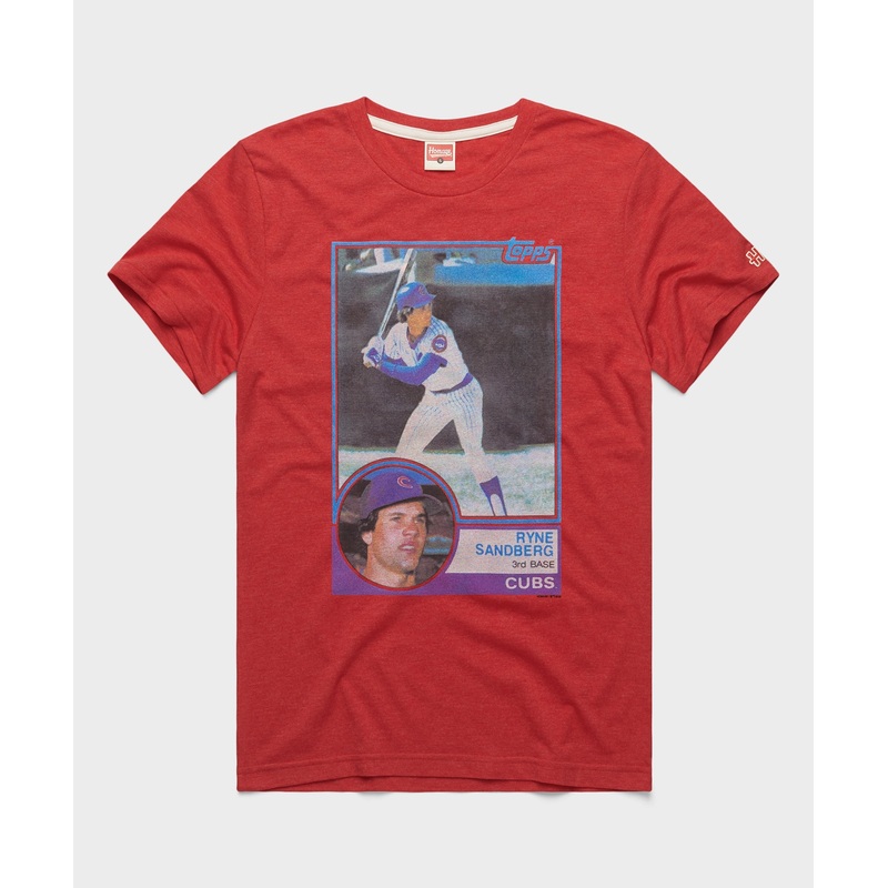 Ryno! It's a Topps rookie card T-shirt for one of the greatest second basemen of all time and a certified Cubs legend, Ryne Sandberg. The ten-time All-Star scored the NL MVP the year after this card's release, and complemented that epic achievement with ni