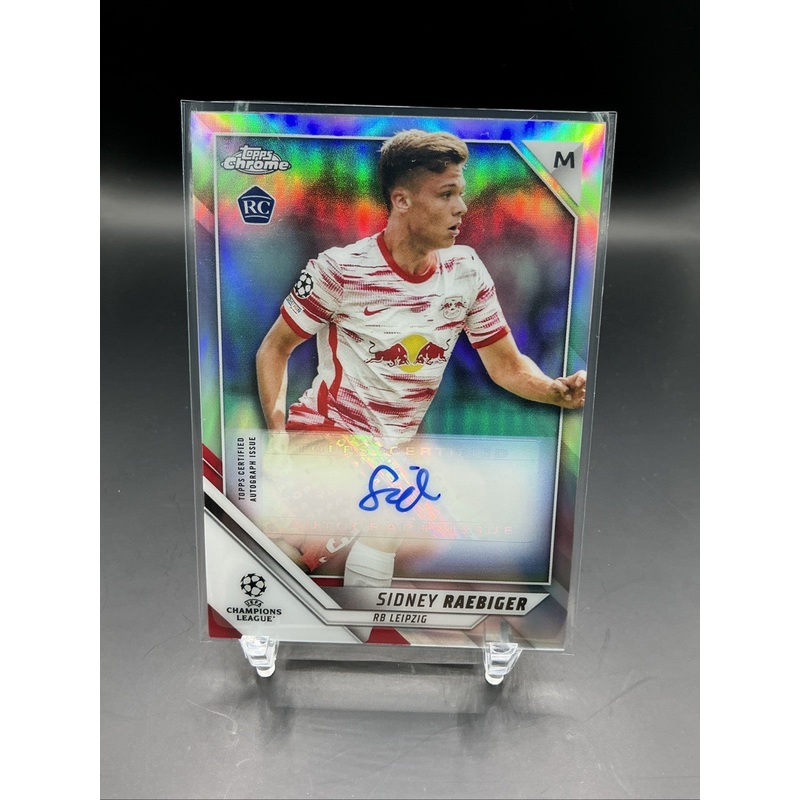 The 2021 Topps UEFA Champions League Sidney Raebiger RC AUTO #CA-SR is a highly sought-after sports trading card featuring an autograph from the rookie player Sidney Raebiger. Manufactured by Topps, this card is part of the UEFA Champions League set for the 2021 season. It is a valuable collectible for fans of soccer and RB Leipzig, making it a desirable addition to any trading card collection.