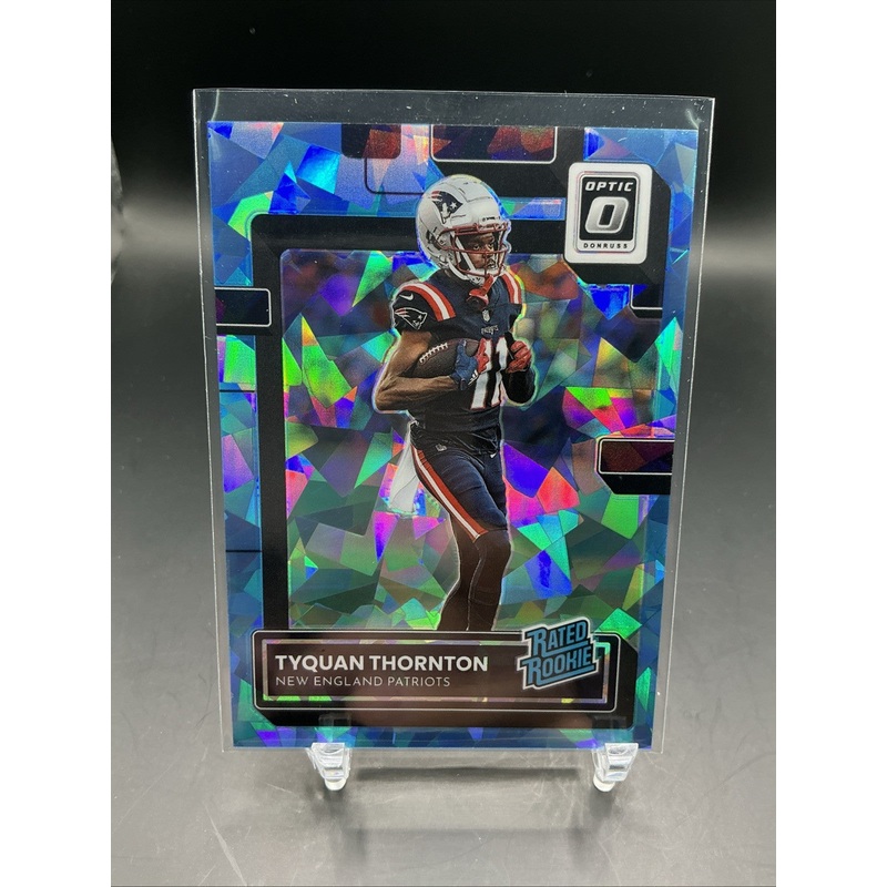 The 2022 Donruss Optic Tyquan Thornton Rated Rookie Blue Ice Prizm SSP 15/15 is a highly sought-after sports trading card featuring the player from the New England Patriots. This limited edition card is part of the 2022 Donruss Optic set and is considered a rare find due to its low print run of 15. With its unique blue ice prizm design, this card is sure to be a standout addition to any football card collection, especially for fans of the NFL and collectors looking for rookie cards.