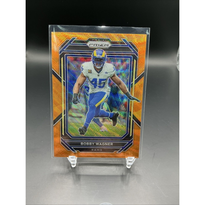 The 2022 Panini Prizm Orange Wave Prizm trading card featuring Bobby Wagner is a rare and collectible item limited to only 60 copies. This single-parallel card is serial numbered and showcases a unique Orange Wave Prizm design, making it highly sought afte