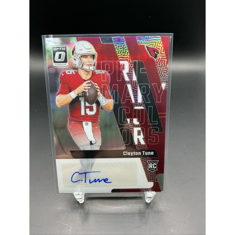 The 2023 Panini Donruss Optic Clayton Tune Primary Colors Auto Rookie RC #6 trading card is a highly sought-after collectible for fans of the National Football League (NFL). This autographed card features a limited print run of just 99 copies, making it a