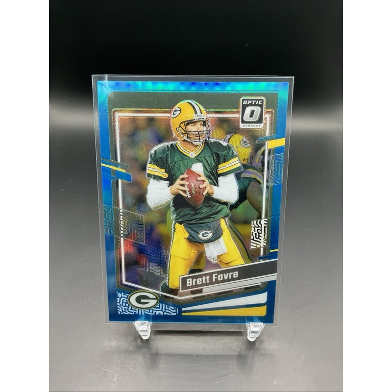The 2023 Panini Donruss Optic Brett Favre Aqua Prizm /299 trading card featuring the legendary Green Bay Packers quarterback is a highly sought-after collectible for football fans and card enthusiasts. This limited edition card, numbered out of 299, showca