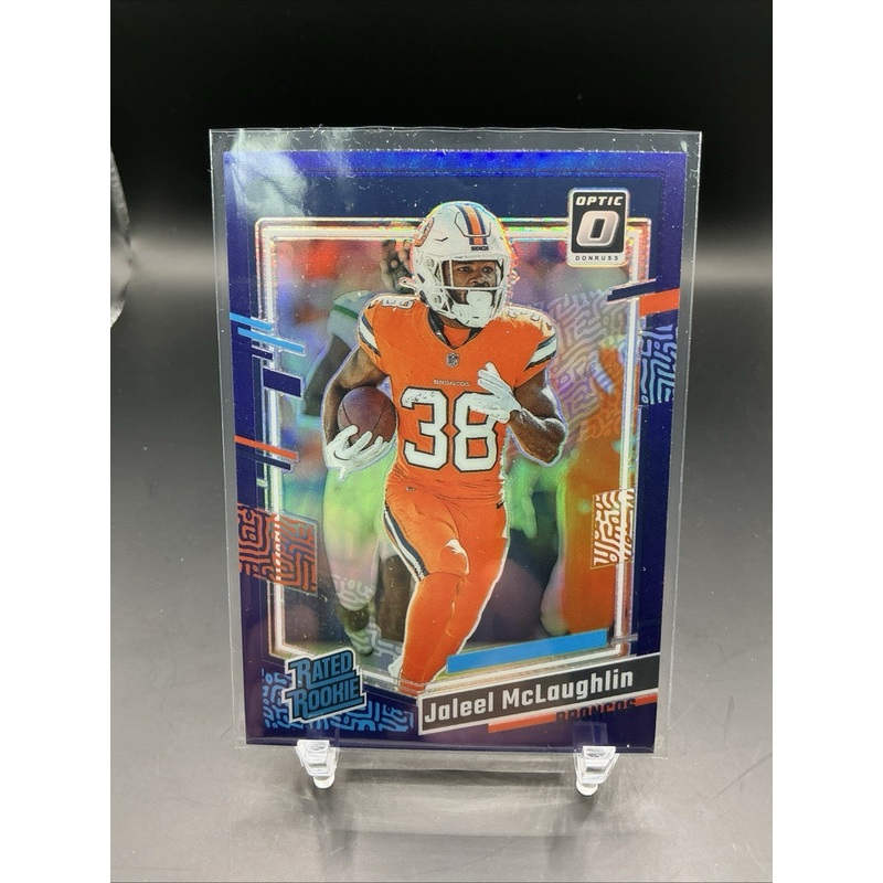 The 2023 Panini Donruss Optic - Rated Rookie Jaleel McLaughlin #232 PURPLE SSP /50 is a highly sought-after sports trading card featuring the player from the Denver Broncos in the National Football League. This original card is part of the 2023 Donruss Opt