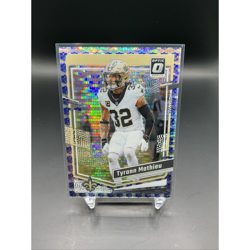The 2023 Panini Optic Football Tyrann Mathieu /32 NFL Shield Logo Variation is a rare and sought-after trading card featuring an exclusive design with the NFL Shield logo. Part of the 2023 Panini Donruss Optic set, this card is a limited edition with a print run of only 32. The card does not come autographed, but it still offers collectors an SSP (super short print) variation. With its unique features and association with the New Orleans Saints, this card is a must-have for football trading card enthusiasts looking to add a valuable piece to their collection.