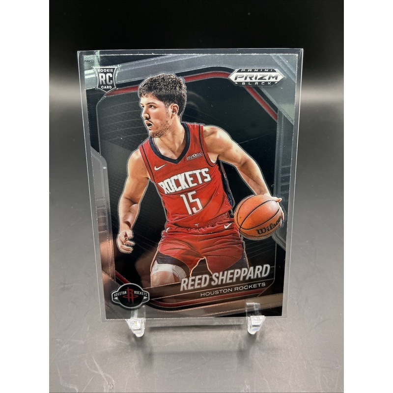 The product is a 2024-2025 Prizm Black Reed Sheppard RC trading card. This rookie card features a Silver Prizm parallel variety, making it desirable for collectors. As a basketball sports trading card, it is a valuable addition to any sports memorabilia co