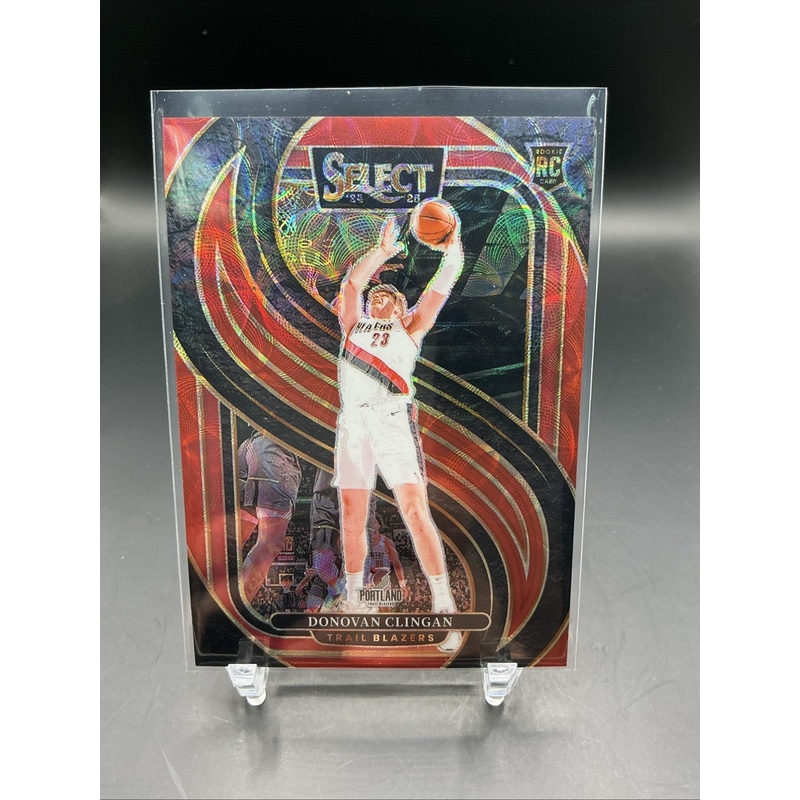 The product is a 2024-25 Panini Select trading card featuring basketball player Donovan Clingan. This specific card is a rookie premier red scope parallel with a card number of 199. Panini is the manufacturer, and the set is from the 2024-25 season. As a sports trading card, this item is a collectible piece for fans and collectors of basketball memorabilia. The red scope parallel adds a unique and desirable element to the card, making it a valuable addition to any trading card collection.