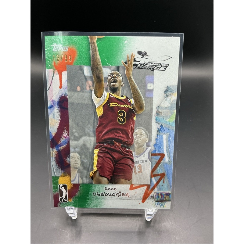The product is a 2024-25 Topps G-League Green parallel trading card featuring Gabe Osabuohien of the Cleveland Charge. This rookie card is part of the base set for the 2024-25 season and is numbered 18 out of 99. As a single-parallel card manufactured by T