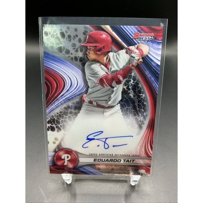 The product is a 2024 Bowman's Best of 2024 Auto trading card featuring baseball player Eduardo Tait from the Philadelphia Phillies. This card is part of the Best of 2024 Autographs insert set by Topps, with a refractor parallel variety. As a rookie card,