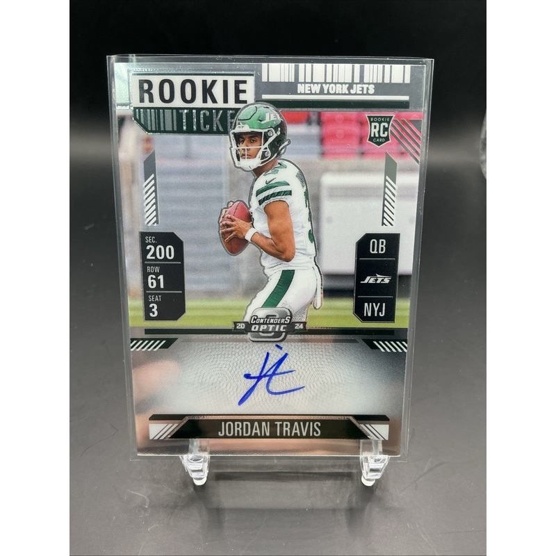The product is a 2024 Contenders Optic trading card featuring rookie autograph of Jordan Travis from the New York Jets. This standard-sized card is hard signed by the player and authenticated by Panini Authentic. It is part of the 2024 Panini Contenders Op