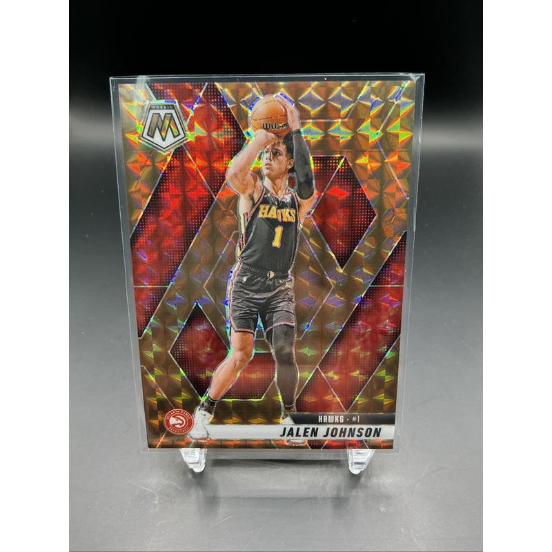 The product is a 2024 Mosaic Jalen Johnson Bronze Prizm trading card numbered out of 75. This card features Jalen Johnson, a player from the Atlanta Hawks in the NBA, and is manufactured by Panini. It is a serial numbered sports trading card, perfect for f