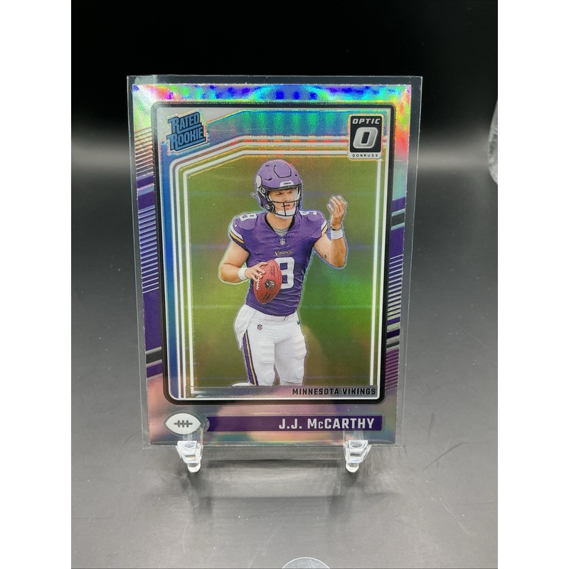 The 2024 Panini Donruss Optic Holo #235 J.J. McCarthy Rated Rookie trading card is a highly sought-after collectible in the sports trading card market. This card features the talented rookie athlete J.J. McCarthy and is part of the Optic parallel variety within the Donruss manufacturer set. With its unique design and limited availability, this card is a valuable addition to any sports card collection, especially for fans of raw sports trading cards.