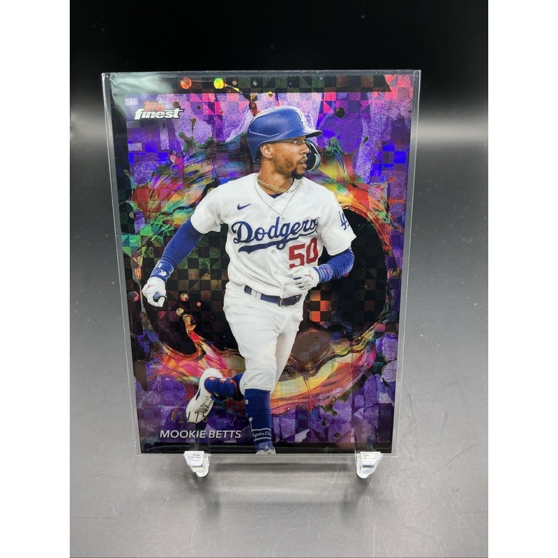 The product is a 2024 Topps Finest rare blue refractor trading card featuring Mookie Betts of the Los Angeles Dodgers. This single-parallel card has a limited print run of only 75 copies, making it a highly sought-after collectible for baseball fans. The card is an original release by Topps and is part of the 2024 Topps Finest set, showcasing Mookie Betts in a unique purple refractor variety that adds to its appeal. This rare and limited edition card is a valuable addition to any sports trading card collection.