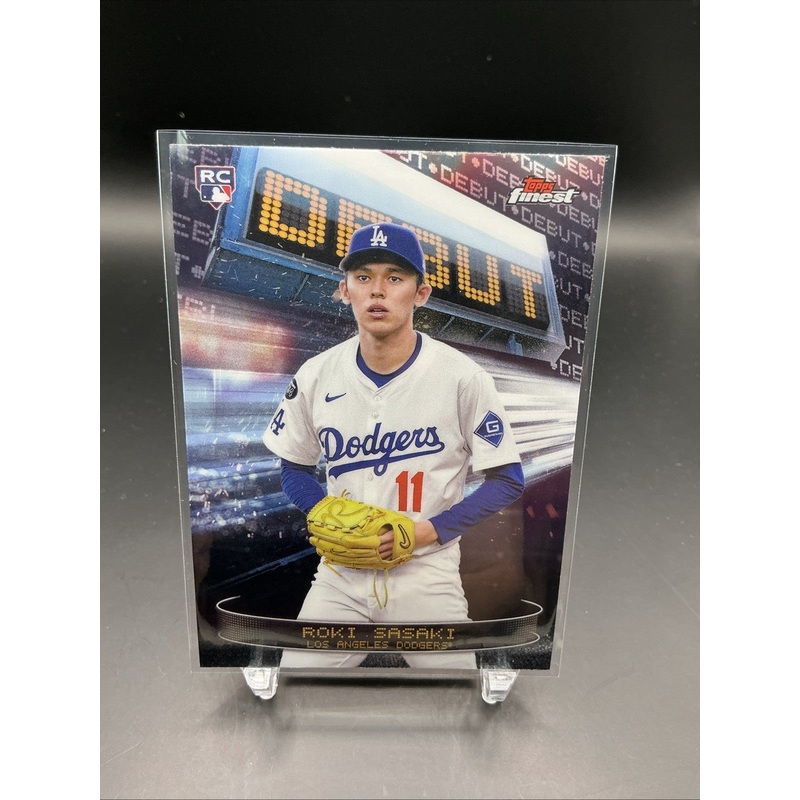 The product is a 2025 Topps Finest trading card featuring Roki Sasaki, a rookie player for the Los Angeles Dodgers in Major League Baseball. This original sports trading card in English showcases the player's debut, making it a valuable addition to any bas