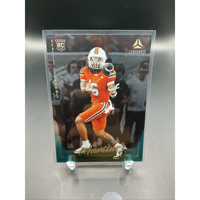 The 2025 Panini Luminance Damien Martinez Teal RC #119 trading card features a rookie player from the Seattle Seahawks in the National Football League (NFL). This original card is made of card stock, has a thickness of 20 Pt., and is part of the base set.