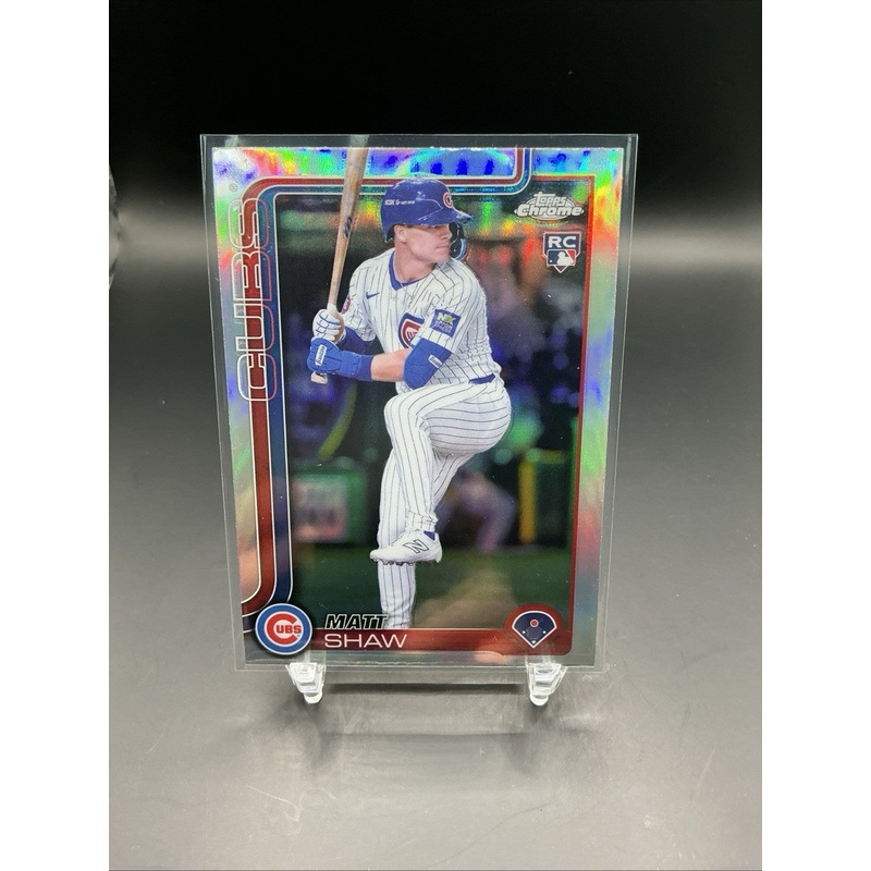 The product is a 2025 Topps Chrome baseball trading card featuring Matt Shaw of the Chicago Cubs. This specific card is a RayWave Refractor parallel variety, making it a rare and collectible item. As a rookie short print, it holds added value for collector