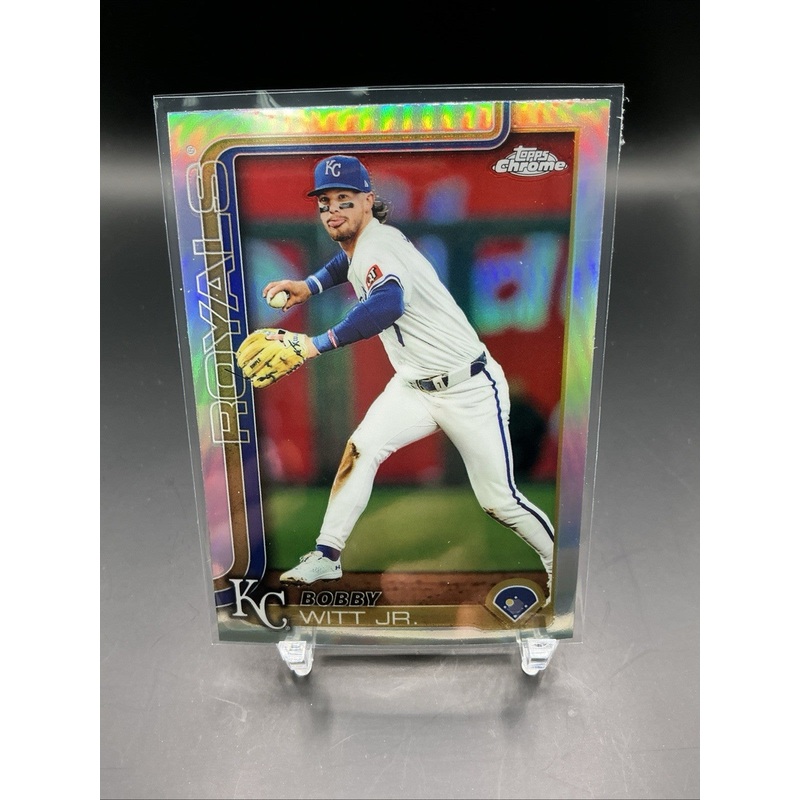 The 2025 Topps Chrome Bobby Witt Jr. Refractor #93 is a standard-sized trading card featuring the Major League Baseball player from the Kansas City Royals. Manufactured by Topps, this original card is made of card stock with a 35 Pt. thickness. The English-language card is a licensed reprint, specifically a refractor parallel variety, adding a unique shine to the design. This collectible item is a sought-after piece for baseball fans and card collectors alike, showcasing the talent and potential of Bobby Witt Jr. in the 2025 MLB season.