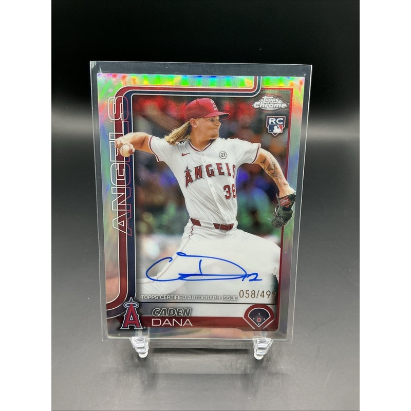 The product is a 2025 Topps Chrome Caden Dana trading card featuring a Refractor Auto parallel, serial numbered to 499. This autographed card is a rookie card of Caden Dana, signed by the player himself in a hard-signed format. It is a part of the Topps Chrome set for Major League Baseball, specifically representing the Los Angeles Angels team. This original card has a standard size and 35 Pt. thickness, making it a sought-after collectible item for baseball fans and card collectors.